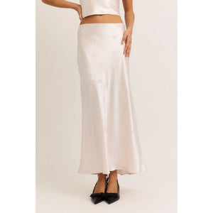 The Corinne set is a beautiful cream satin style set with an asymmetrical neckline on the cropped top with the maxi skirt in the same heart pattern. Size chart in photos. Model is wearing a size small. Model specsHeight: 5'8"Bust:...